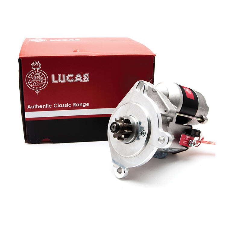 Lucas up-rated, light weight starter motor, fits Aston Martin DB1 to DB6, and Riley 2.5 (1950-52). 10 toothed gear. Strong, powerful, offset gear-reduced starter motor, delivering huge cranking torque through a set of steel internal gears. Lightweight, compact and durable this unit starts the engine faster with immense power, whilst drawing less current from the battery