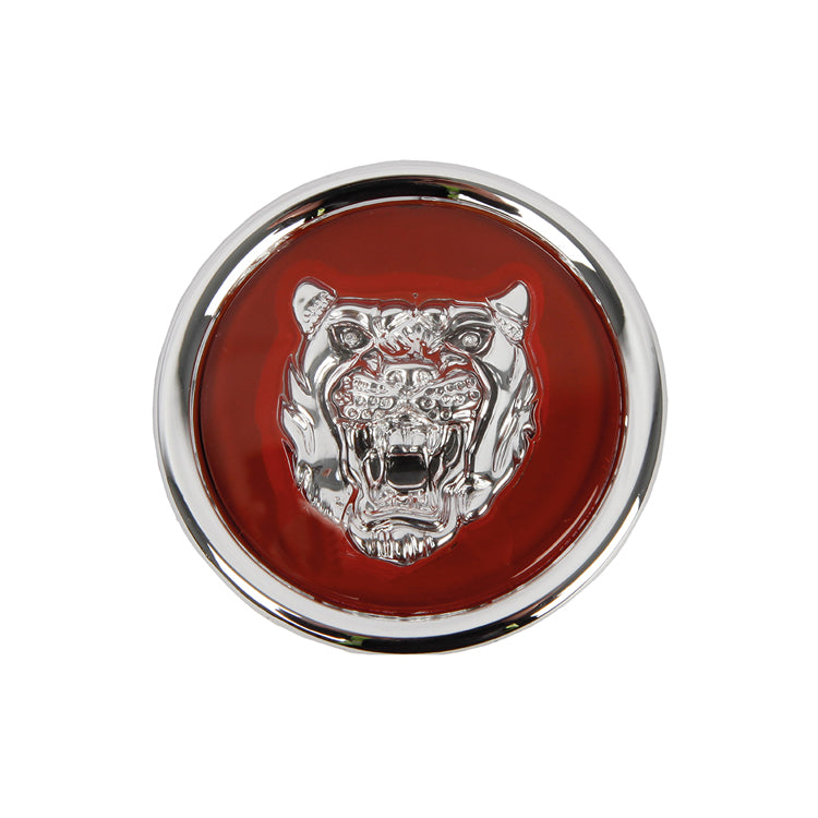 Road Wheel Centre Badge - Chrome Rimmed, Silver Growler Head Logo On A Ruby Background.